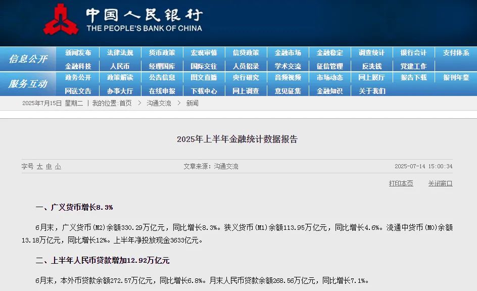 7月14日,央行公布2025年上半年金融数据。总体来看,金融总量保持合理增长,主要指标增速略有回升,对实体经济的支持力度稳固。