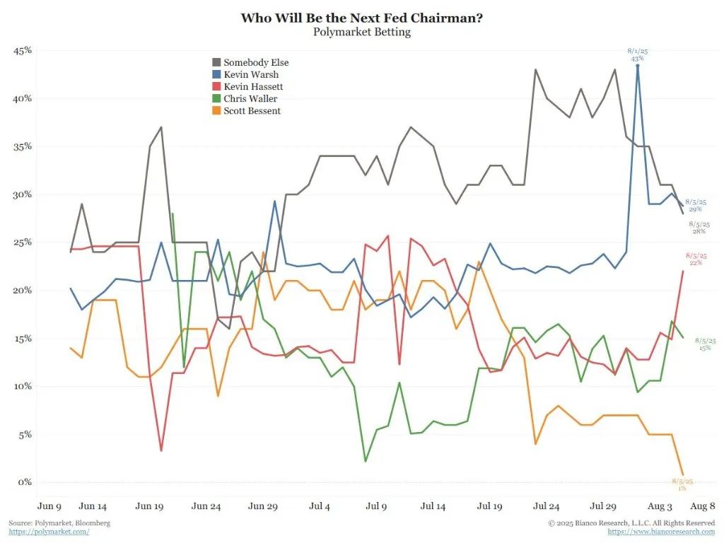 Bianco Research总裁、资深宏观分析师Jim Bianco也在社交平摊X上发帖称,“还有另一位尚未讨论的候选人”,并附上一张“全球最大线上预测市场”Polymarket最新美联储主席押注的走势图。