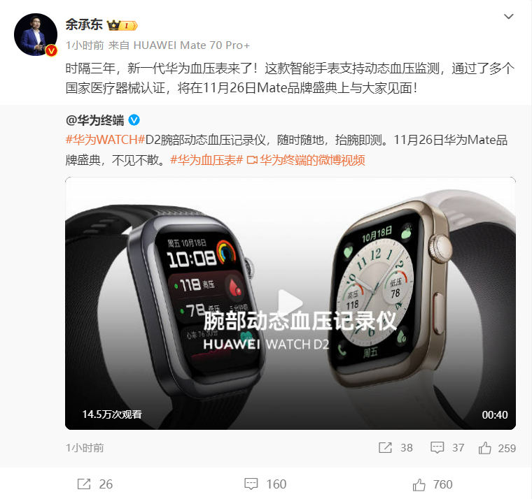 127 05-15 11:53余承东:华为新款血压表通过多国医疗器械认证
